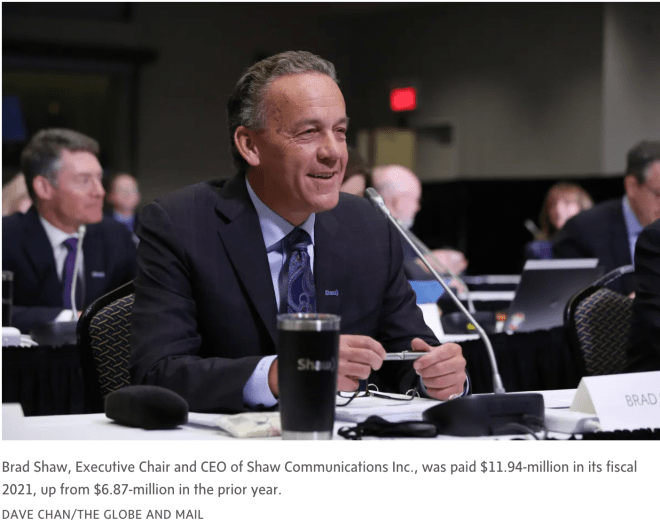Brad Shaw’s ker-ching moment. The Globe and Mail’s David Milstead reports that Brad Shaw’s CEO pay packet doubled this year to $12 million (the average compensation for CEO of a TSX company is $7.65 million). If the Rogers-Shaw merger is approved, the son of company founder J.R. Shaw will oversee a $26 billion sale to the Rogers family. He also boasts one of Canada’s top corporate pensions at $134 million.
