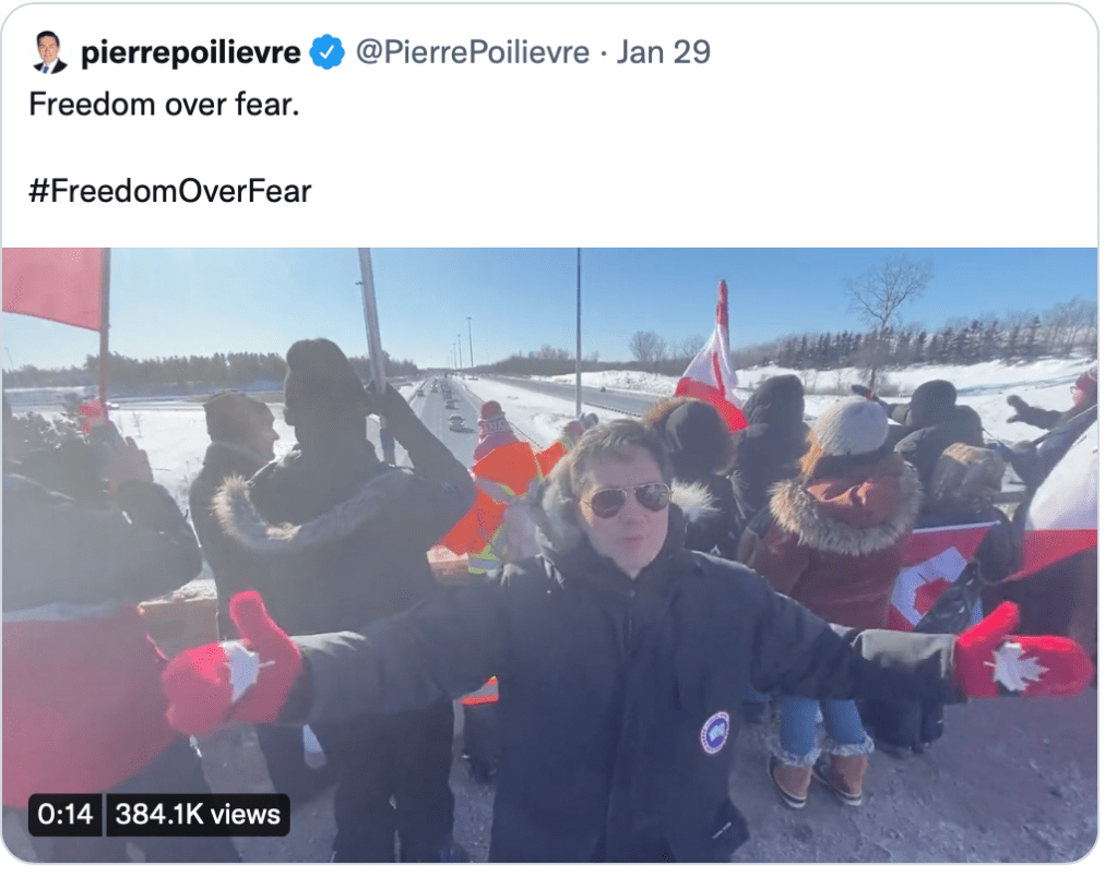 Pierre Poilievre’s viral video tweeted January 29th in solidarity with Convoy protesters accuses “the media” of “insulting Canadians.” His most recent video road-testing his leadership narrative goes full Trump, weaving in attacks on the mainstream media as a member of the establishment cabal plotting against freedom.