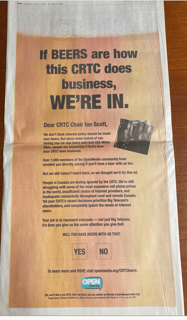 Earlier this month Scott probably decided he could ignore the photo no longer. He gave an interview to the Toronto Star’s Tony Wong and explained that he and Bibic are old friends (Scott spent years working for Telus in regulatory affairs) and were meeting socially in Ottawa’s best known pub for a beer.