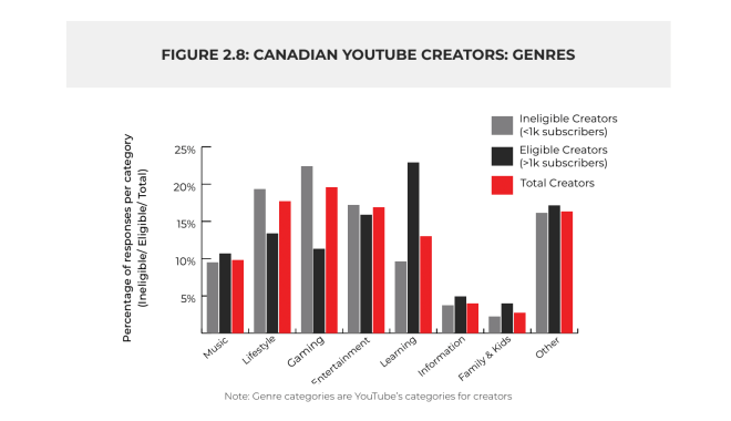 - Divide YouTube programming into major categories of commercial activity, keeping an eye on the size of the media business sponsoring the channel, its success in monetizing content, and whether it seeks audiences in the CRTC’s categories of priority Canadian content (i.e. news, drama, sports, music, entertainment.)