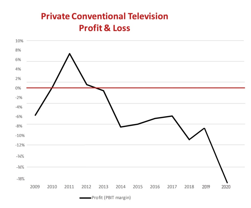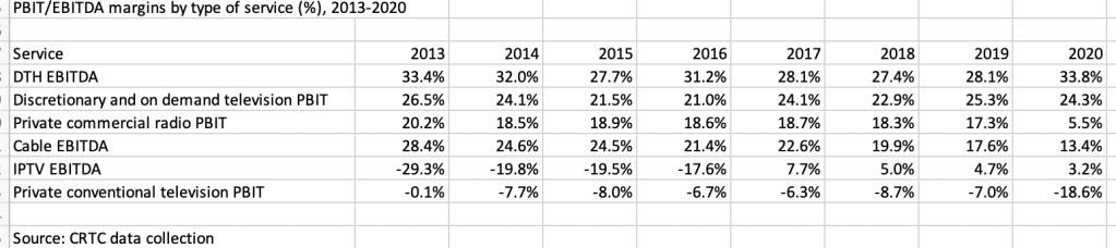 More to the point, our broadcasting economics have only gotten worse for conventional TV, meaning local news, as these 2020 CRTC statistics on PBIT/EBITDA margins demonstrate: