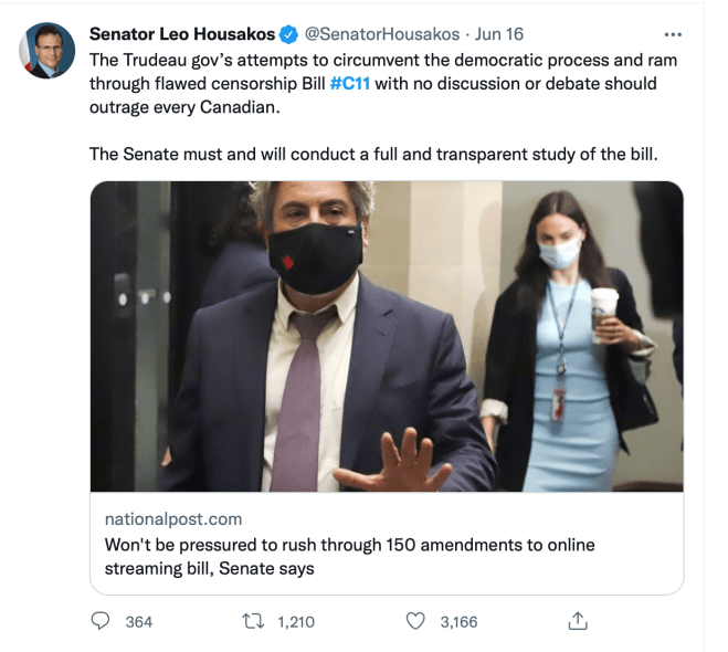 La Chambre des communes a transmis la Loi sur la diffusion continue en ligne au Sénat, où le tweet du chef des conservateurs au Sénat Leo Housakos (ci-dessus) annonce un dernier round acharné, au sein de cette assemblée, pour le projet de loi C-11.