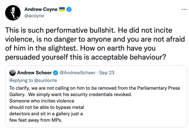 “The Gallery wishes to dissociate itself from the comments made by this journalist … the Press Gallery would like to emphasize that intimidation, in all its forms, is unacceptable … it is important to remember that it is not for politicians to determine who is or isn’t a member of the Gallery.”