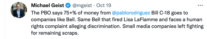 Other criticisms of C-18 are in the realm of political gamesmanship. Geist’s post reporting that TV news organizations might be in line for as much as $250M in compensation from FaceGoogle seemed designed to provoke a populist outcry against the much-maligned CBC and pantomime villains Bell Media and Rogers City-TV. He also tweeted that Bell Media CTV’s firing of Lisa LaFlamme was relevant to the policy discussion:
