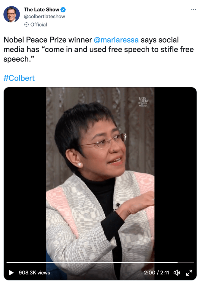 Journalist and Nobel Prize winner Maria Ressa appeared on Stephen Colbert’s Late Show on November 30th to describe the impact of Facebook’s content moderation failure on political violence and democracy in Philippines.