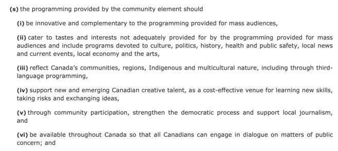 The reason that CACTUS was back in the legislative fray Wednesday night, pitching to the Senate Committee, is that only eight of 67 community stations are licensed by the CRTC —which explicitly commands them to broadcast news— the rest are either license-exempt or online only. That’s why CACTUS is seeking a further amendment to the Bill in section 27(1)(b). Different from the pre-qualifying section 27(1)(a), this clause explicitly requires the production of news to get to the negotiating table with Big Tech.