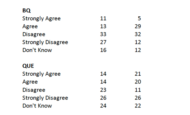 Then there are the Bloc-leaning respondents and this is where the action is. There is a very noticeable move from defunding-support to defunding-opposition. The overall Québec results show a similar shift.