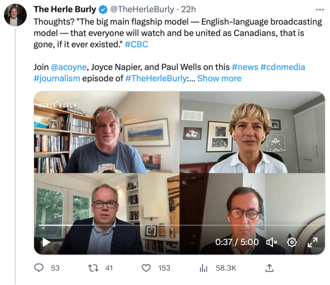 This is not a reference to Pierre Poilievre and his promise to defund the public broadcaster. It is a reference to Andrew Coyne continuing to call for ‘refunding’ —as mendacious a term as you will find— the CBC by eliminating the Parliamentary grant and imposing a paid subscription model.