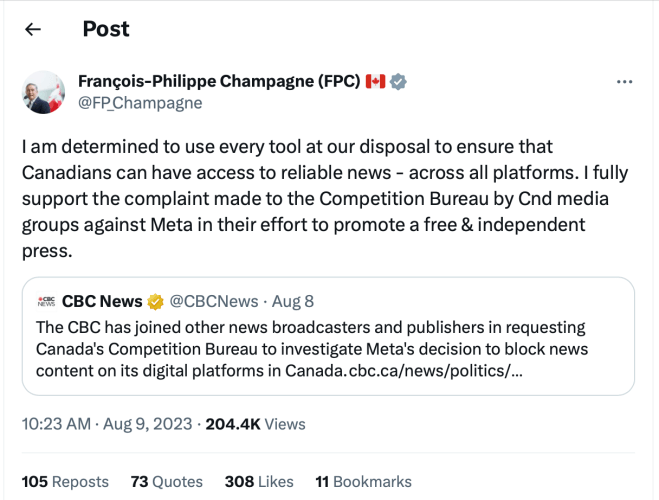 (Update: A reader contacted me pointing out the Minister has the authority under section 10(1) of the Competition Act to direct the Bureau to investigate. Possibly this mitigates Champagne’s actions but also raises the question of why the Minister didn’t act on his own, prior to the request being made by news agencies).
