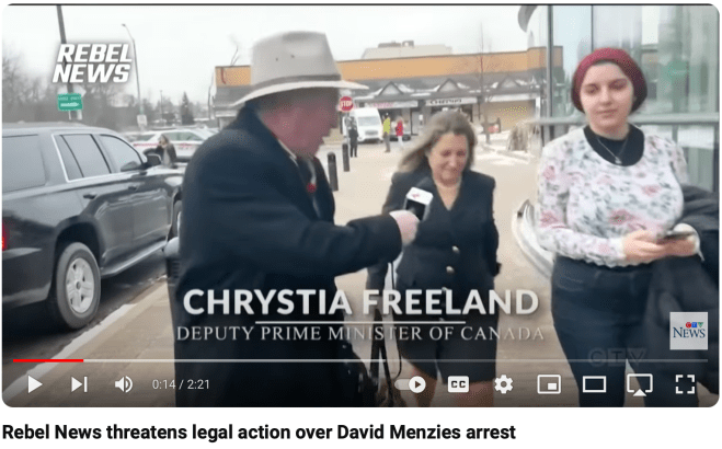 As recounted in CTV News and Globe and Mail reports, Rebel News media personality David Menzies was arrested (and subsequently released without charge) by the RCMP for assaulting a member of Chrystia Freeland’s security detail.