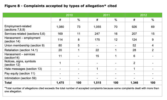 That got me curious about data, so I contacted the librarian at the Commission and asked for numbers on the section 13 caseload before it was repealed. It seems the Commission’s Annual Reports began tracking (or at least reporting) that in 2010 as section 13 became increasingly controversial.