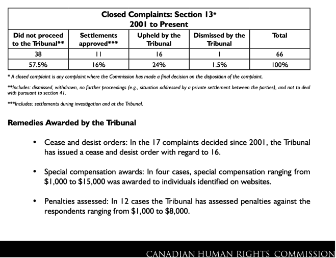 In 2012 for example, the Commission received 1500 complaints overall (not just section 13). Half were weeded out at the complaint stage, 209 were settled, 190 were dismissed and 113 were sent on for adjudication by the Human Rights Tribunal.