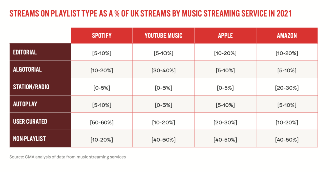 As this chart illustrates, the major streaming platforms don’t always put equal emphasis upon the available song picking options: