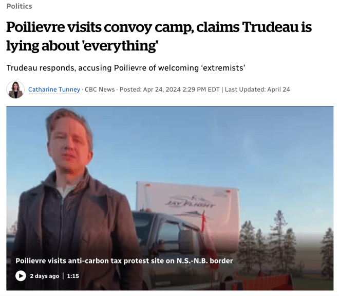 All of that is grist for the mill in the CBC news story (Poilievre enthusiastically identifying with Convoy-style voices) and the Star’s opinion piece (Poilievre’s associations with those voices alienates a lot of Canadian voters).
