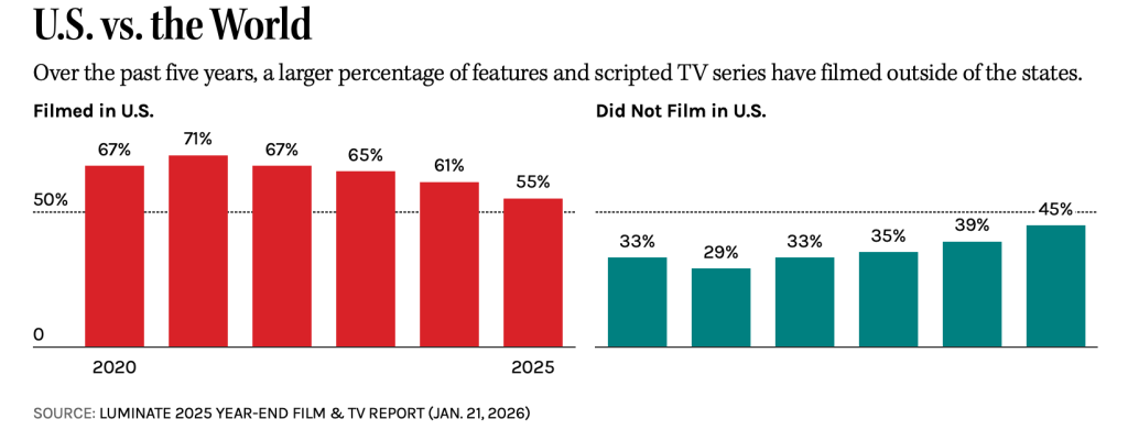 The context of this is the retrenchment of streamer spending on new productions since 2022. The Hollywood Reporter has fresh data about where US shows are being made and the only thing that is indisputable is that California is hurting and in an incremental way non-US foreign location shooting is taking a bigger share of a reduced production market . Canada’s volume is steady over time; UK and Irish shooting has gone up.