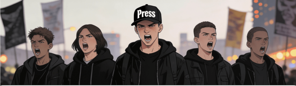 Prior to last year’s federal election campaign, a cadre of protesters gathered on my block in a highly successful effort to disrupt Chrystia Freeland’s nomination meeting. The image that stuck in my mind was the young man in the thick of it who was wearing a “Press” ball cap.