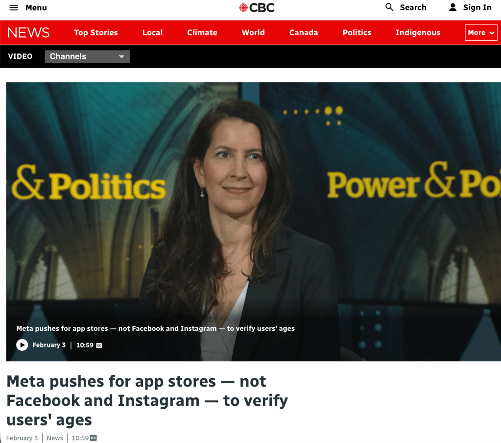 Earlier this month, Meta spokesperson Rachel Curran was invited to a ten-minute spot on David Cochrane’s CBC news hour to discuss Meta’s pitch to have the federal government impose age verification responsibilities on app stores (Google and Apple) rather than apps (Meta).