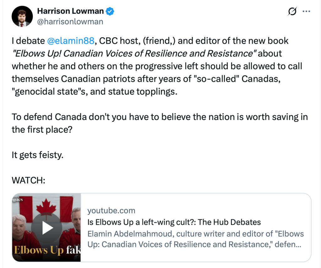 Abdelmahmoud had no good answer for the parochial exclusion of conservative perspectives on a common Canadian challenge, the threat of annexation: he weakly implied a lack of interest from conservatives to meet his time sensitive call-out for contributions.