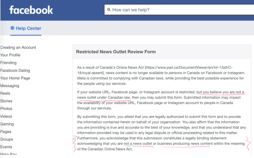 As the steady flow of Narcity posts suggest to the casual observer, Facebook appears to be a digital news intermediary that “makes news content produced by news outlets available to persons in Canada,” ban or no ban.