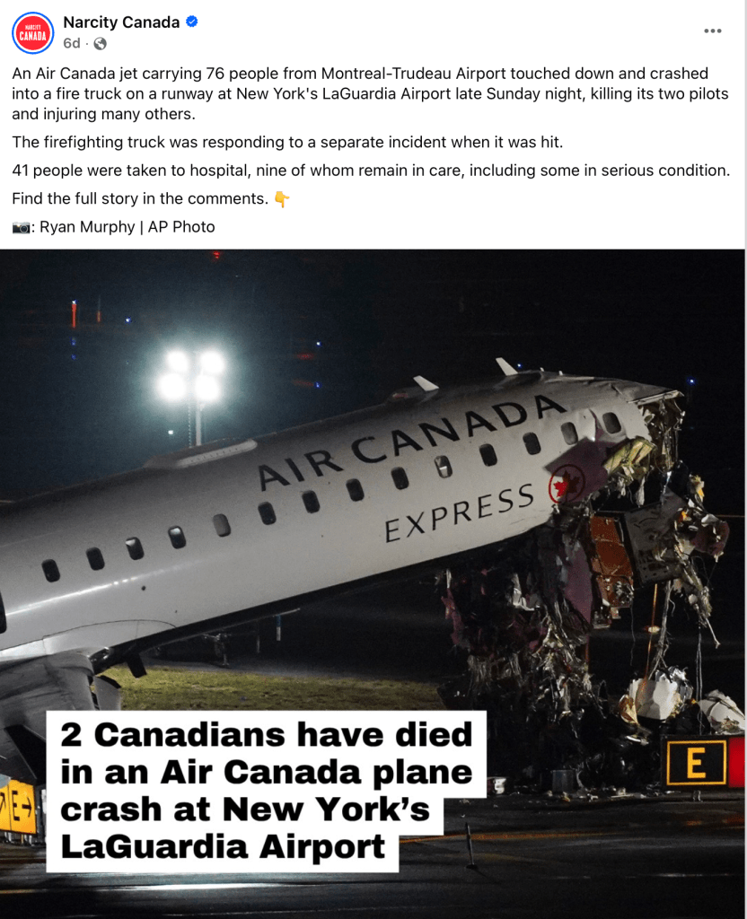Replatformed by Meta, Narcity’s posts are a firehose of Canadian Press’s current events reporting, with less frequent posts of its own lifestyle and travel news.