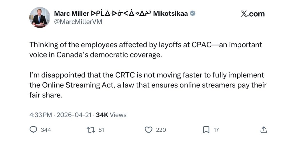 An online hue and cry followed in response to the CPAC announcement and Heritage minister Marc Miller joined in with a tweet suggesting that the CRTC’s delay in implementing the Online Streaming Act was to blame: