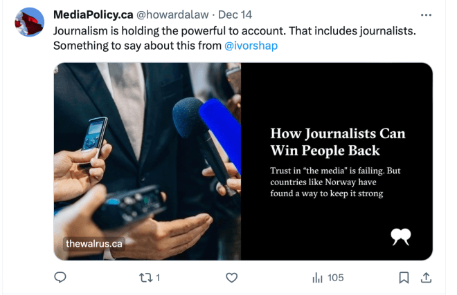 Earlier this week The Walrus published Ivor Shapiro’s “How Journalists Can Win People Back,” an excerpt from his new book. By coincidence I had just interviewed him for publication in MediaPolicy.ca.