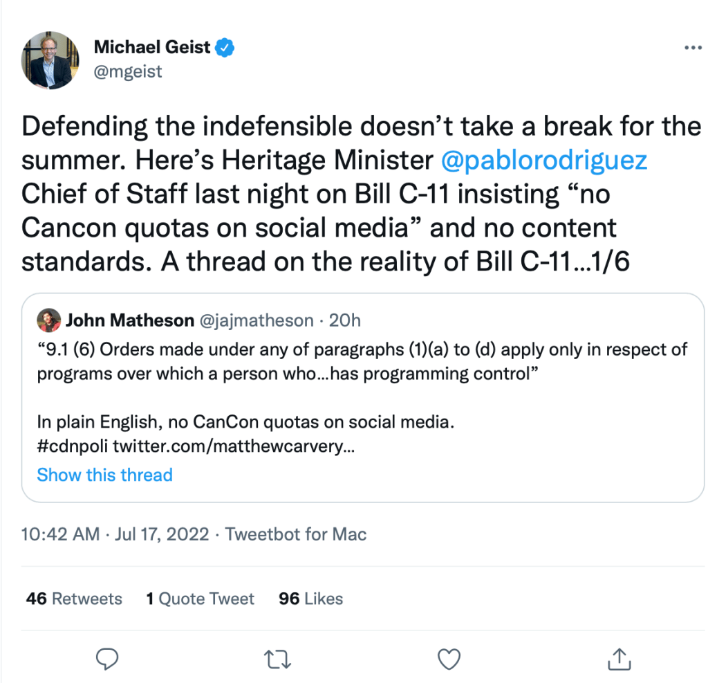 Now perhaps Mr Geist’s fellow C-11 critics —Open Media, Digital First Canada, Washington Post columnist J.J.McCullough, and Conservative MP Rachael Thomas— will make the same acknowledgements and be more precise in their public statements.