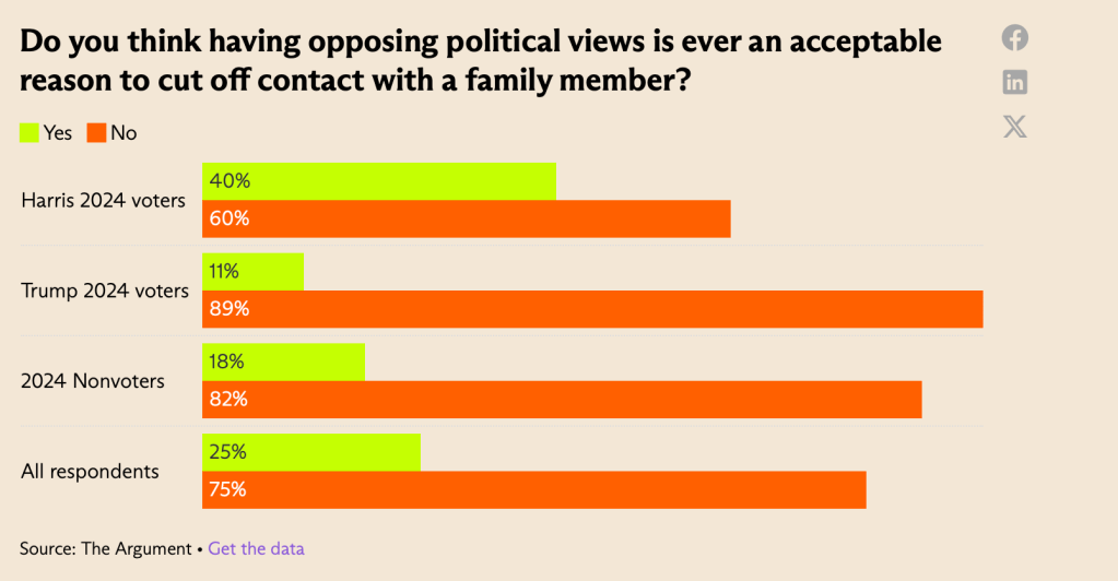 But still, I was left agape by the poll finding that 40% of Kamala Harris voters would consider cutting off contact with a family member “for opposing political views.” Only 11% of Trump voters would do that.
