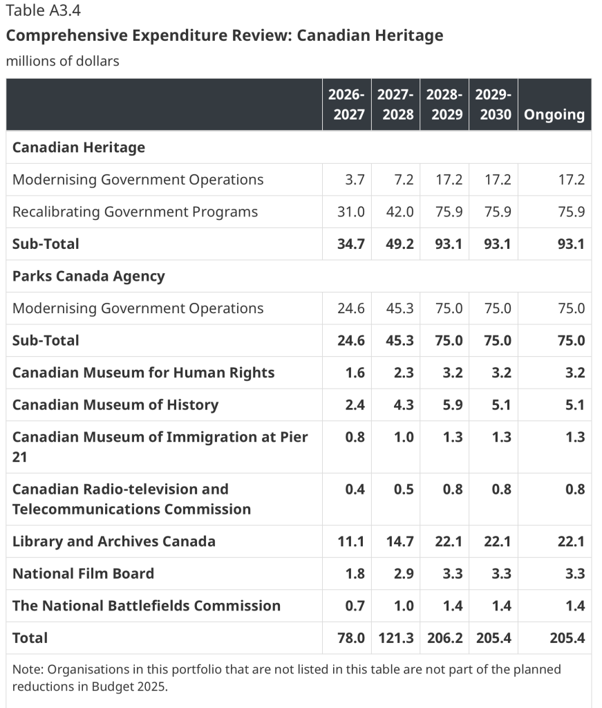 On the other hand, the budget document includes projected cuts to Canadian Heritage expenditures which might be either civil servant salaries or “recalibrated” program spending. Guilbeault pointed out to the Globe that the $93 million savings figure was 5%, not 15% of expenditures.