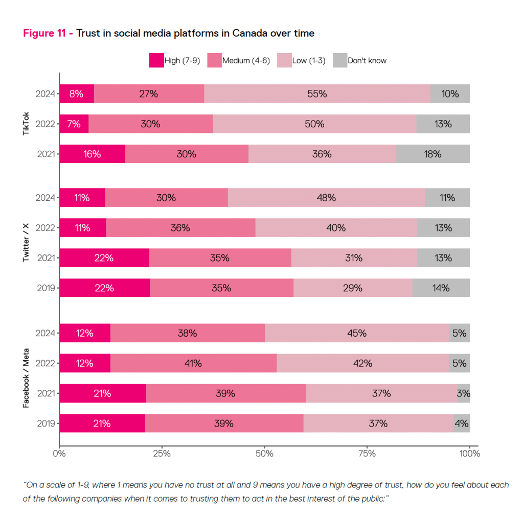On the other side of the trust coin, popular trust of social media platforms is very low (and getting lower over time), even among the young Canadians who flock to them: